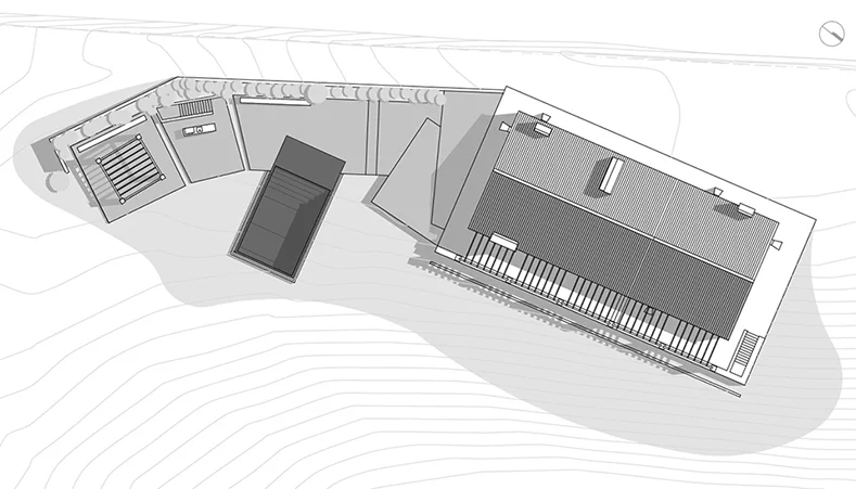 Organization and design of pool and supporting areas, porch, machinery room / garage, access trails and property entrance.